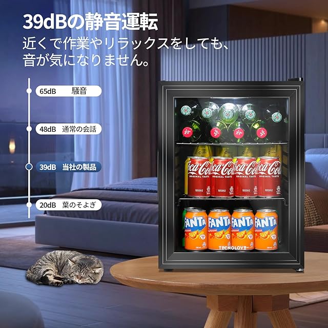 【庫内ライトと静音設計】1.庫内ライト付きなので、暗い場所でも飲み物を簡単に見つけられ、便利に使えます。 2.わずか39dBの静音設計で、ゲームやテレビを楽しみながらも快適にご使用いただけます。