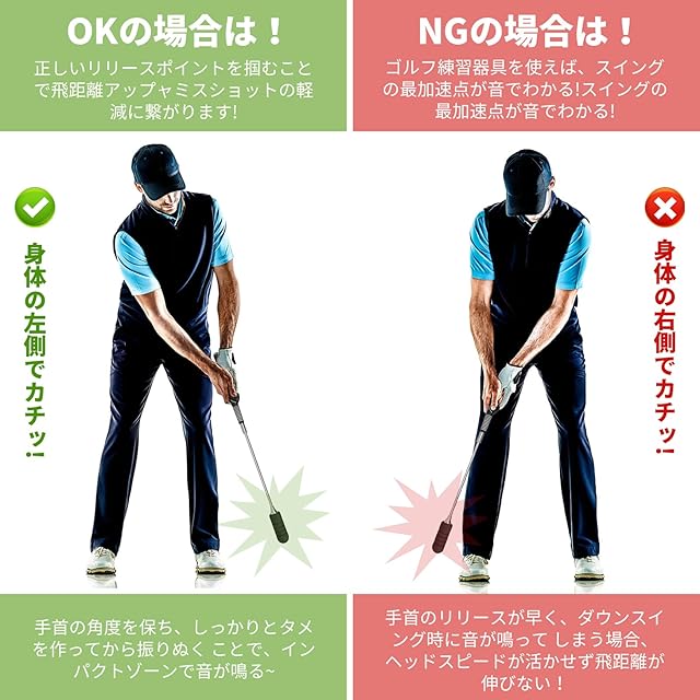 【音による即時フィードバック 】ゴルフ 練習 のスイング中に発するクリック音が、スイングタイミングを正確にフィードバックします。正しくスイングを行えば、インパクトゾーンで「カチッ」という音が鳴り、正しいリリースのタイミングを体得することができます。多くのゴルファーが直面する「腕だけで振る」や「アーリーリリース」といった問題も、この音によるフィードバック機能で解決できます。このゴルフ 素振り の音を目安にスイングを繰り返すことで、無意識のうちに理想的な身体の動きとスイングが身につき、飛距離の向上につながります。