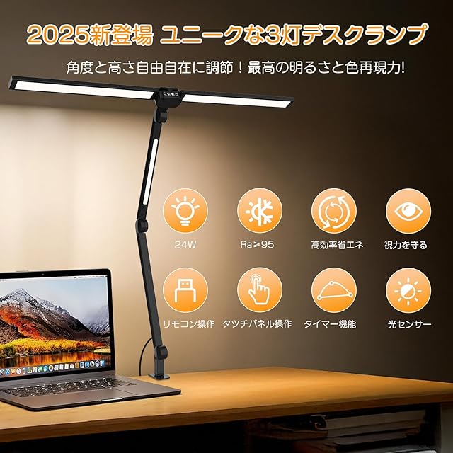 【2025新登場】 RUNELVES デスクライト 【24W・3つ光源・環境補助光・1700lm・高演色性・目に優しい・多角度調節】 無段階調光 4段調色 スタンドライト 電気スタンド クランプ 幅広 リモコン&タッチパネル制御 タイマー機能 卓上ライト デスク 照明 寝室/読書/勉強/仕事に適用 おしゃれ プレゼント