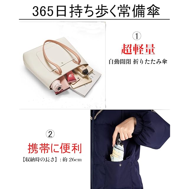 【自動開閉式折りたたみ傘】ワンタッチで自動開閉ができる日傘は、片手でも使え、とっさに傘を出して開ける際にはストレスがありません。車の乗り降りの際や、片手しかあいて無い時には大変便利です。普通な通勤用カバンや車に常備しておけば、緊急天候にも対応できます。