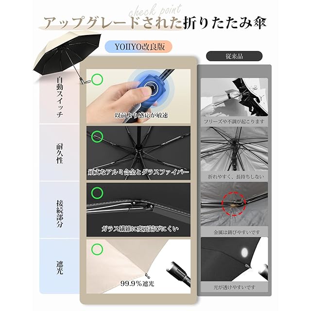 商品名:YOIIYO おりたたみ傘 日傘 uvカット 100 遮光 折り畳み 日傘 メンズ 折りたたみ傘 晴雨兼用 レディース ワンタッチ自動開閉 折り畳み傘 大きいサイズ 丈夫 軽量 8本骨 強風に強い 豪雨対応 紫外線遮断 UVカット 完全遮光 コンパクト 折畳傘 収納ポーチ付き