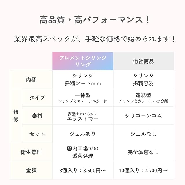 【オールインワン&業界最高スペックが、手軽な価格で始められる!】 精液を1滴も無駄にしない一体型のシリンジをはじめ、採精シートと専用ホルダー、妊活ジェル(潤滑ジェル)など必要なものが全て入っているため、買い足しの必要がなく、届いたその日にすぐご使用いただけます。 セット内容:シリンジ(3本)採精シートmini(3枚)、採精シートホルダー(1個)、プレメントジェル(3個)