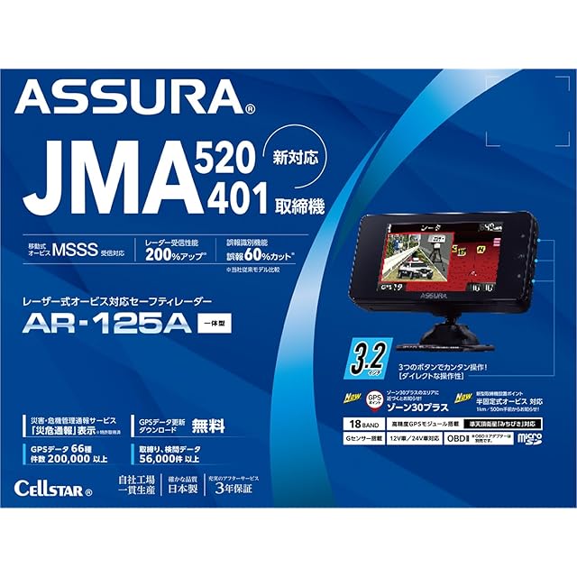 商品名:セルスター レーザー式オービス対応セーフティレーダー AR-125A JMA520/401対応 MSSS対応一体型 18バンド 高精度GPSモジュール搭載 準天頂衛星「みちびき」対応 ゾーン30プラス対応 OBDII対応 3.2インチ GPSデータ更新無料 日本製 3年 CELLSTAR