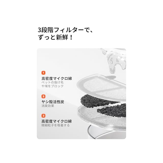 安全で快適な飲水体験:ワイヤレスポンプを採用し、電磁誘導による給電で漏電の心配がありません。フィルターは椰子殻活性炭を高密度マイクロ綿で挟んだ三層構造で、毛髪、ホコリ、微粒子を効果的に除去し、ニオイもスッキリ吸着して、いつでもキレイな水をキープします。さらに、トレイは飲みやすい3.57°の傾斜設計で、脊椎への負担を軽減し、猫の顎の濡れを防ぎます。安心・安全で快適な飲水タイム!