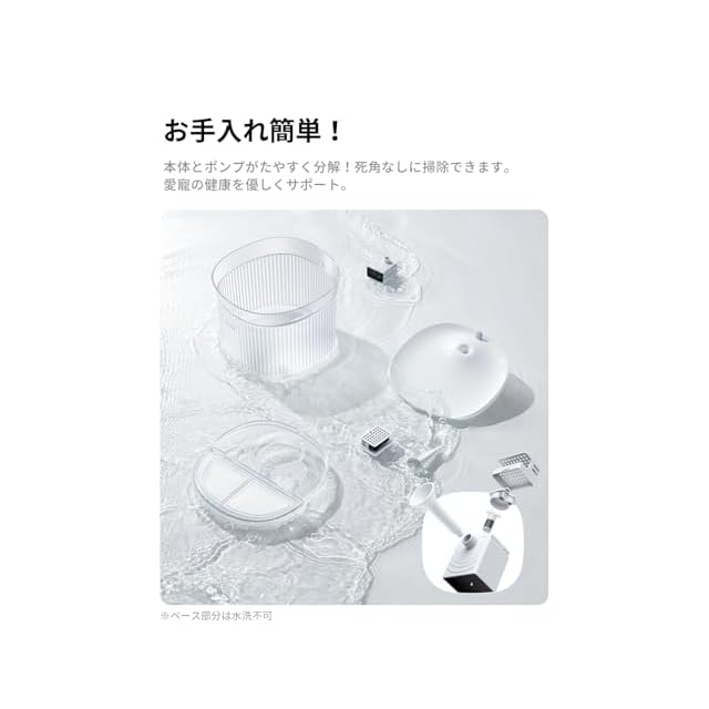 サッと洗え、いつでもピカピカ:本体とポンプは合計9つのパーツで構成され、ポンプまでも簡単に分解できます。さらに、タンクとベースは分離式なので、全体を持ち上げる必要がなく、簡単に死角なしに洗浄できます。飼い主様の使いやすさと愛犬・猫の健康を両立します。