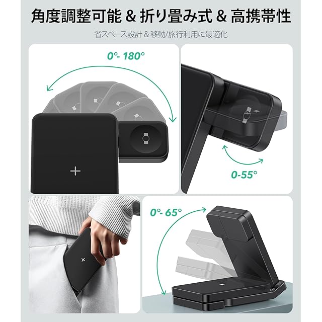 【折りたたみ式&携帯便利なデザイン】 こちらの3 in 1 折りたたみ式ワイヤレス充電器は、0°〜65°の角度調整が可能で、スマートフォンを縦向き・横向きのどちらでも充電できます。ウォッチ用充電スタンドは180°後方に回転でき、収納もスムーズ。折りたたむと非常にコンパクトで、省スペース設計。Samsungのスマートフォンより小さく、スマホ2台分の厚さほどなので、旅行や出張に最適です。複数の充電器やケーブルを持ち運ぶ必要がなく、自宅、オフィス、外出先などさまざまなシーンで活躍します。
