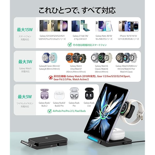 【Samsung専用3in1ワイヤレス充電器】Samsung向けの3台同時充電対応ワイヤレス充電ステーション。Galaxy S25/S24/S23/S22/S21/S20/S10 Plus/FE/Ultra/Eシリーズ、Galaxy Z Flip/Foldシリーズ、Galaxy Note 20/10シリーズには最大15W出力で充電可能。Galaxy Watch Ultra、Watch 8、Watch 7、Watch 6 Classic、Watch 6、Watch 5 Pro(45mm)、Watch 5、Watch 4、Watch 4 Classic、Watch 3には最大3W出力。Galaxy Buds Pro 3、Buds Live、Buds Plus、Buds 2には最大5W出力でのワイヤレス充電に対応。また、Qi規格対応の他社製スマートフォンやイヤホンにも幅広く対応しています。