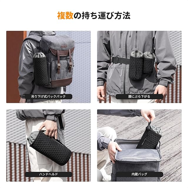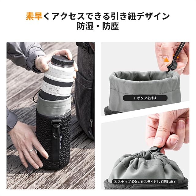 【優れた機能】衝撃吸収力に優れた10mmの厚手のクッション素材を採用しているレンズケースなので、揺れなどによる衝撃からレンズを保護して持ち運びが可能です。巾着袋の開口部は便利で速い、レンズを外部の衝撃、ほこり、湿気から保護し、レンズの安全性を確保します。