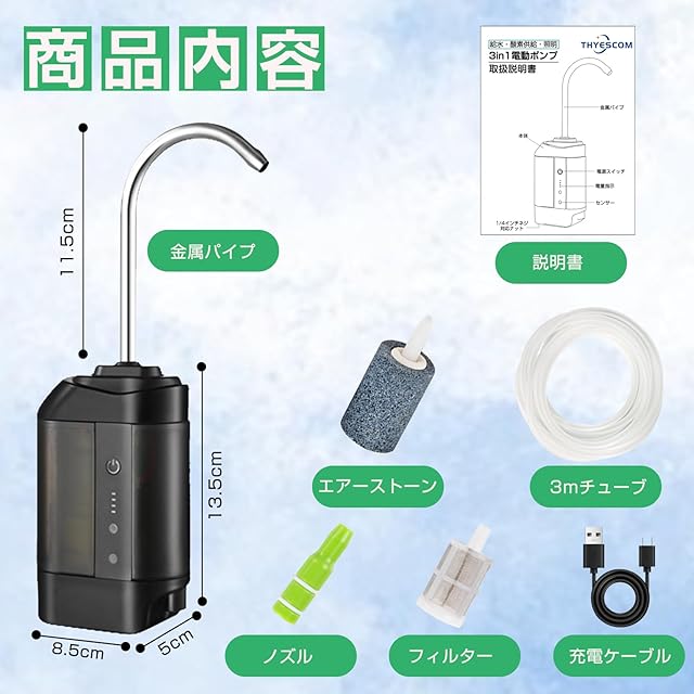 ウォーターポンプ エアーポンプ THYESCOM 給水・酸素供給・照明 3in1アウトドア電動ポンプ 給水ぽんぷ 2600mAh電池内蔵 水汲み上げ 簡易式水栓 センサー感知機能付き 3mチューブ付き 釣り用 防災用 屋外用