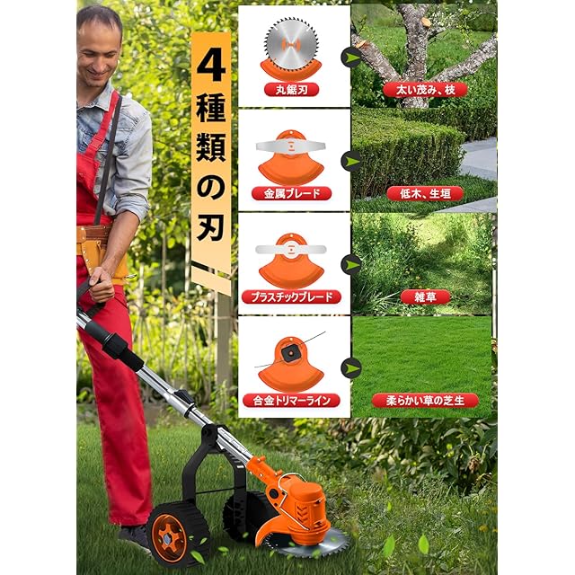 【2025新登場&強化版】充電式草刈り機 草刈り機 芝刈り機 コードレス 4種類の替刃 大容量バッテリー2個 18vマキタバッテリー互換 伸縮式 脱着式補助輪 一台多役電動草刈り機 伸縮&角度調整 補助ハンドル 多機能刈払機 軽量 安全設計 女性でも簡単 除草 雑草 芝生 畑 庭作業 農業 園芸 家庭用 日本語説明書付&PSE認証済み