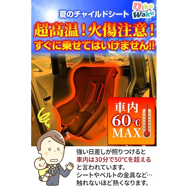 【真夏の車中 高温の座席対策!】真夏の炎天下で駐車した後の車内は、エンジン停止後わずか30分で約50℃を超えるといいます。チャイルドシートにはベルト金具などもあり、その部分は火傷になるほどの高温に!車から離れる前に、nikowakuの遮熱シートをサッとかけるだけで熱を遮断し、チャイルドシートの温度上昇を防ぎます。