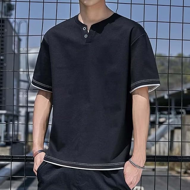 [Yezai] tシャツ メンズ 半袖 重ね着風 夏服 五分袖 通気性 速乾 Vネック カジュアル ゆったり 無地 オシャレ かっこいい 夏 ティーシャツ 大きいサイズ hei-L