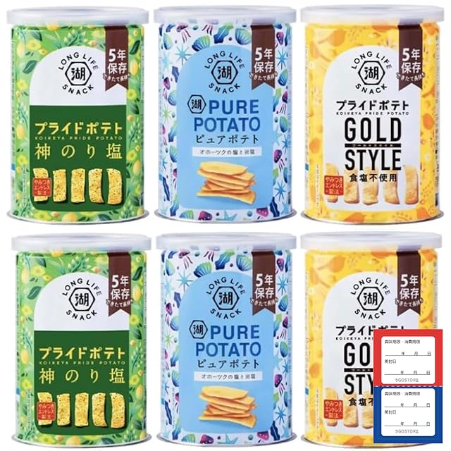 商品名:【6缶セット】プライドポテト 神のり塩 ピュアポテト 湖池屋 GOLD STYLE 食塩不使用 芋まるごと オホーツクの塩と岩塩 KOIKEYA LONG LIFE SNACK 5年保存 非常食 防災食 保存食 備蓄 お菓子 詰め合わせ まとめ買い 保存缶 ポテトチップス おかし 防災用品 避難グッズ 災害対策 避難用品 地震対策 食べ比べ ローリングストック