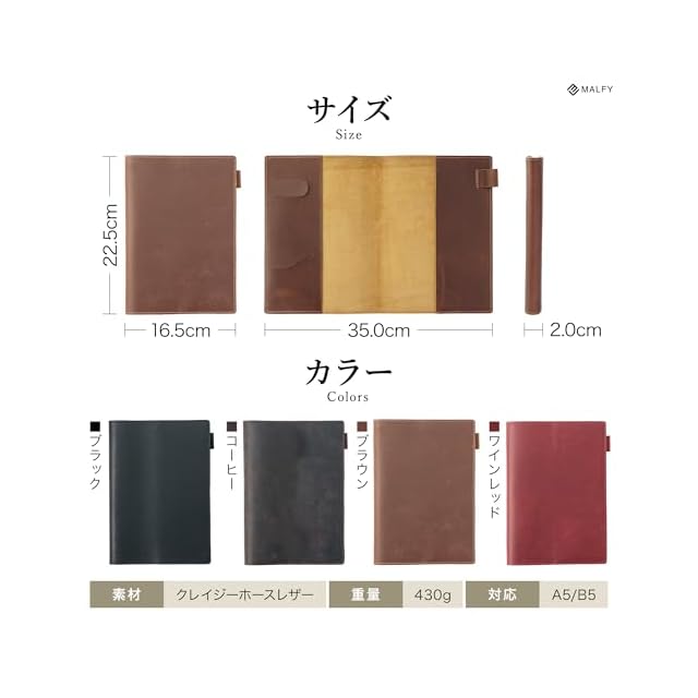 【商品詳細】〇サイズ:縦22.5×横16.5×厚さ2cm 〇本体重量:約195g 〇素材:牛本革(クレイジーホースレザー)〇カラー:ブラック、ブラウン、コーヒー、ワインレッド 〇セット内容:本革ノートカバー、真鍮製ブックマーククリップ、A5罫線ノート88枚 〇ブランド:MALFY ※国内自社検品
