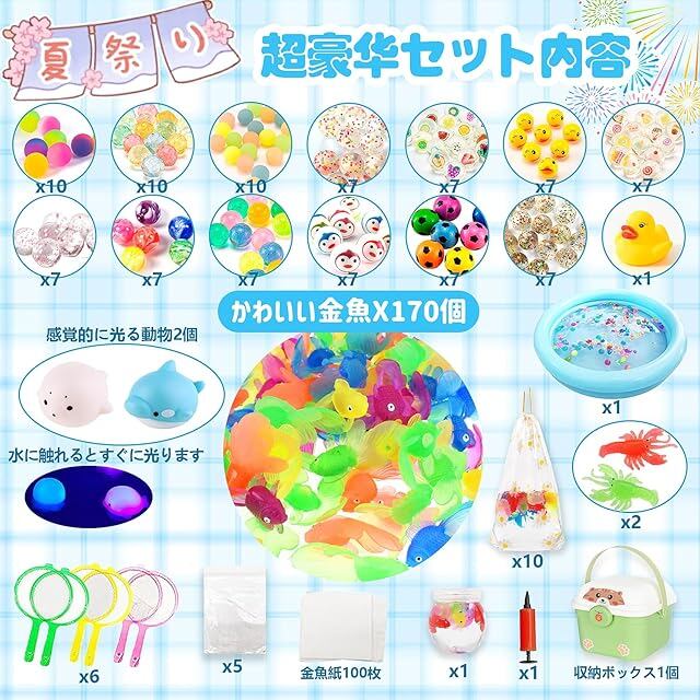 【大容量セット】スーパーボール:100個 (10つの蛍光スーパーボールも含まれています)、光る動物2個(発光するイルカ+発光するアシカ)、おもちゃ金魚:170ケ 、おもちゃピピエビ:2ケ 、浮かぶ黄色いアヒル1個、ポイ:6本(付け替え式、ランダムカラー)、スペア紙:1セット(100枚)、金魚袋:15枚、プラスチック漂流ボトル1個、丸プール(ビニール、直径:50cm)1個、空気入れ(小さいサイズ)1個、収納ボックス1個。そんな夏の風物詩が気軽に味わえる、金魚すくいに必要な用品が揃ったセット!