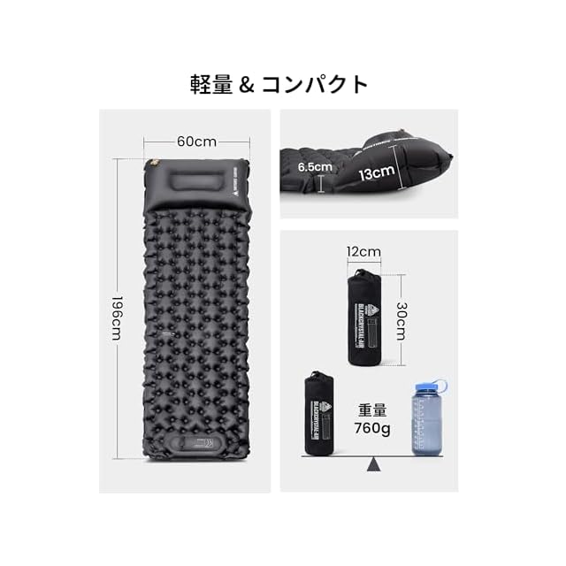 商品名:OneTigris BLACKCRYSTAL エアーマット 足踏み式 キャンプマット 無限連結 枕付き 196 x 60 x 13/6.5 cm 防水 軽量 コンパクト収納 収納袋付き 持ち運び便利 アウトドア ソロキャンプ ファミリーキャンプ 車中泊 来客用 防災用