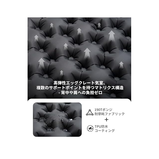 【バランスなサポート・クッション性よい】OneTigris BLACKCRYSTAL エアーマットは卵型気室構造、ハニカム空気室は体圧分散でき、仰向けでも横向きでも、良いサポートを確保。卵型の構造は、追加の保護層を必要とせずに直接衝撃を吸収し、クッション性もよい。 枕と一体化したデザイン、調節可能なエアバッグ枕(枕のバルブで微小空気調節)、首椎の曲線にフィット、従来のエアー枕の首吊りなどの問題を避ける