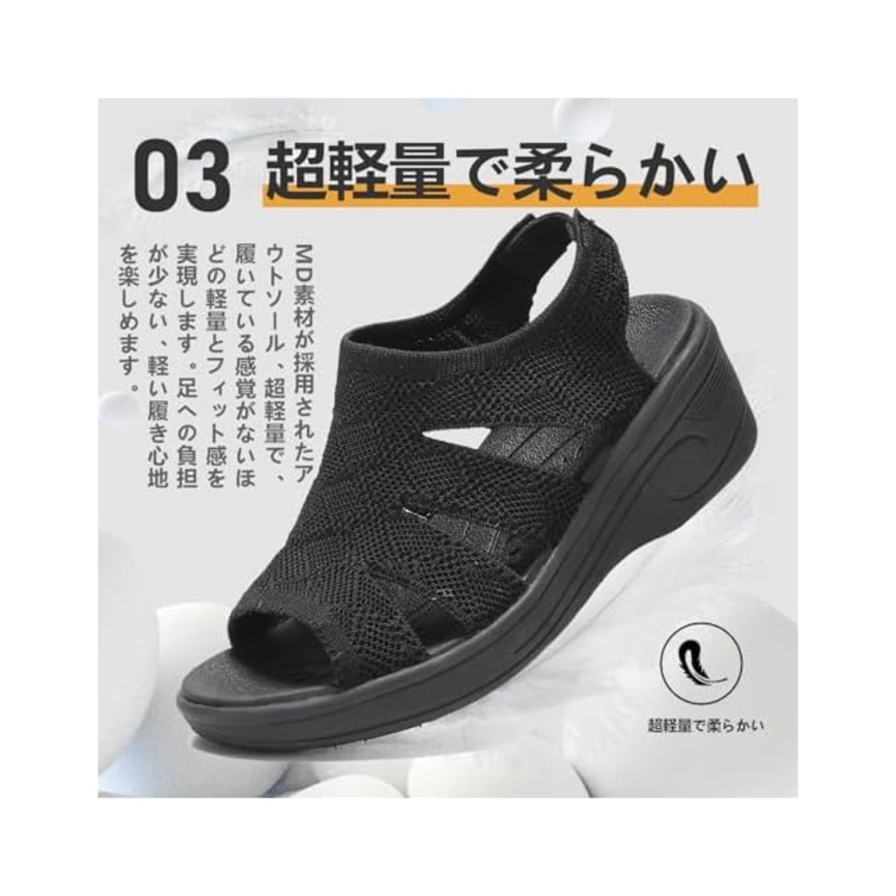 【履きやすい厚底サンダル】接地面から、つま先で約3cm、かかとで約6cmの高さのソールです。約2cm程の高低差の傾斜で負担なく履けるサンダルです。適度な体格比率をアップし、美脚効果を実現、自信を増強します。それぞれの一歩は全て気楽であり思いのままにすることができます。