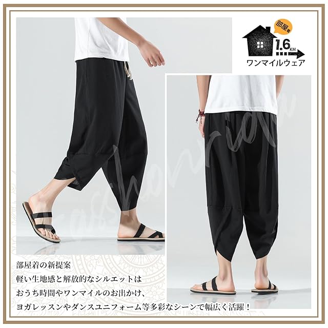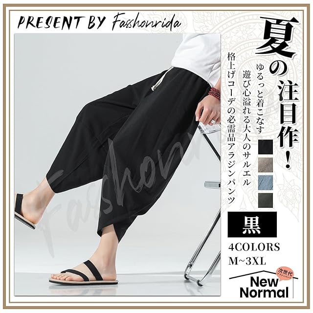 商品名:[Fasshonrida] サルエルパンツ メンズ アラジンパンツ 夏用 ズボン 7分丈 ワイドパンツ 大きいサイズ ゆったり ボトムス イージー ぱんつ 涼しい リネン クロップド エスニック 袴 カジュアル 春 夏 black M
