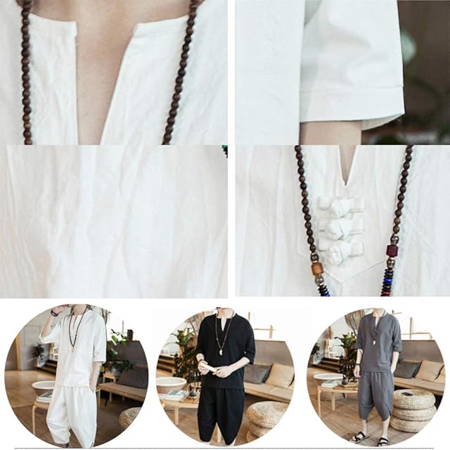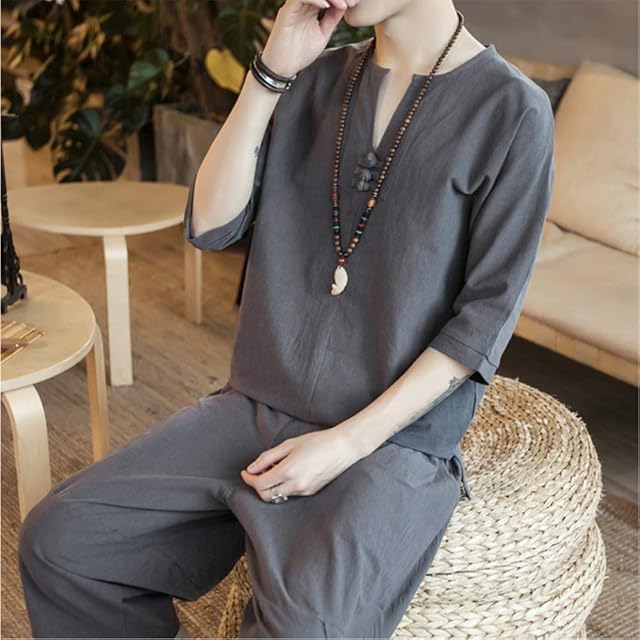 [foveitaa] 夏服 メンズ 部屋着 和風 服 Tシャツ 七分袖 麻 シャツ 半袖 上下セット トップス ハーフパンツ ショート パンツ 上下 Vネック 和式パーカー セット アップ 無地 柄 Gray L