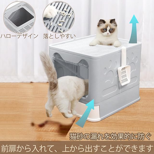 商品名:封閉式大型猫トイレ 除臭、51cm x 41cm x 38cm 折りたたみ式ステンレス製猫砂トレー 蓋付きスコップ 前進上出式、簡単掃除