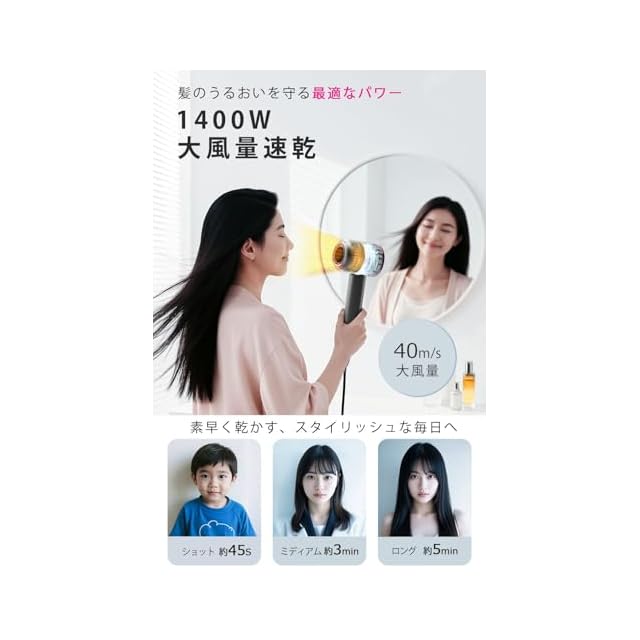 商品名:ドライヤー 大風量 【2025先端モデル・温度&風速表示】 ヘアドライヤー 速乾 美髪 高速ドライヤー 1400W 高濃度マイナスイオン 40m/s高風速 4段階温度調節&3段階風量 AIスマート温度制御 温冷風ワンタッチ切替 スマートメモリー機能 サロン級仕様 ヘアケア 髪質改善 マグネットノズル/ホルダー付き 防塵フィルター 軽量 旅行/サロン/家庭用/プレゼント