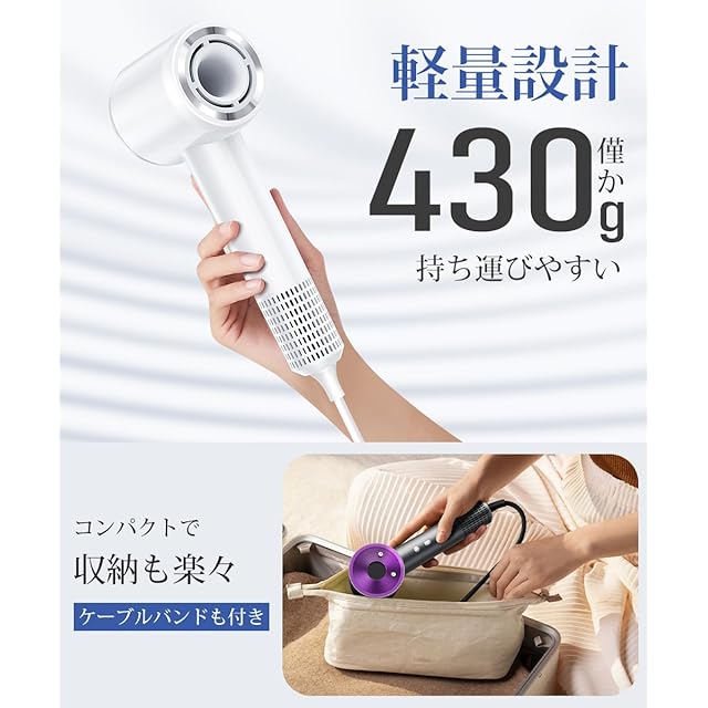 【軽量・折りたたみ設計|旅行にも最適な携帯ヘアドライヤー】コンパクトでわずか390gの軽量設計のため、長時間の使用でも疲れにくく、携帯性に優れたヘアドライヤーです。折りたたみ式で収納も簡単、収納ポーチ付きで旅行・出張・スポーツジムなど、どこでもサロン級の仕上がりに。まさに携帯ドライヤーの新定番です。