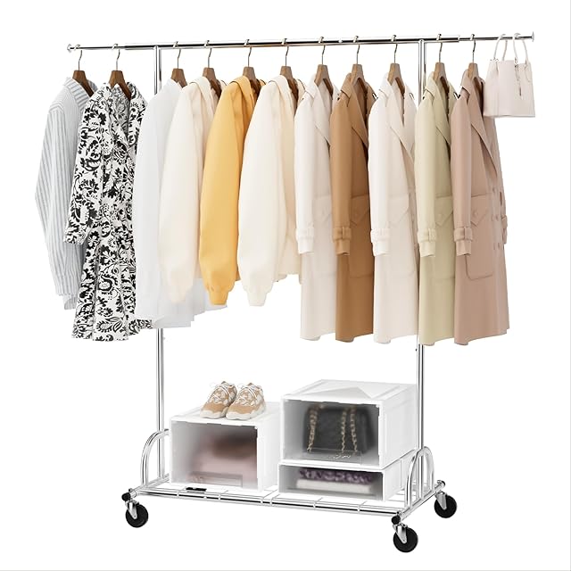 商品名:SPECILITE パイプハンガーラック 耐荷重80kg 大容量 幅90~140cm 頑丈なメタル 折り畳める 幅、高さ伸縮 組み立て簡単 衣類収納 キャスターと棚付き シルバー