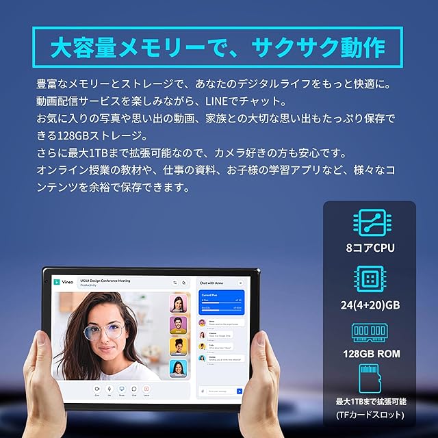 【Android 15搭載・高性能スペック】 Android 15 OSを搭載し、使いやすさとセキュリティを強化。128GB大容量ストレージに加え、最大1TBまでmicroSDカード対応。アプリのダウンロード、プロフィール写真や動画の保存など、ストレージ不足の心配はいりません。分割画面、フローティングウィンドウなどの機能をサポートしており、マルチタスクもスムーズに処理できる高性能タブレットです。 【高品質10インチディスプレイ・デュアルカメラ】
