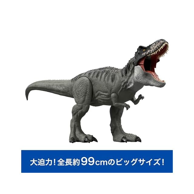 【内容】映画『ジュラシック・ワールド/復活の大地』に登場する全長約99cmの大迫力のスーパービッグサイズのT-レックス!口を開けて別売りのミニフィギュアを食べさせよう!おなかを開けると出てくるよ! Universal City Studios LLC and Amblin Entertainment, Inc. All Rights Reserved.