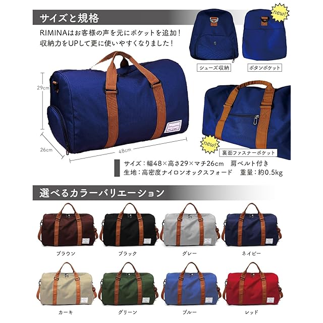 ✅【選べるカラー】 豊富なカラーバリエーションから、お気に入りの1色をお選び頂けます。カラーはメンズ・レディース・ユニセックスにお使い頂ける、ネイビー、ブルー、グレー、ブラウン、グリーン、カーキ、ブラック、レッドの8色。男性にも女性にも合う豊富なカラーバリエーションからご選択下さい。✅【3WAYで使い方色々】 軽量でシンプル。上品な生地感で使いやすい落ち着いた大人デザイン。手持ち・斜め掛け(肩ベルト)・肩掛け(肩ベルト)と3wayのスタイルで使用が可能です。取外し・調整可能のショルダーベルトは肩に負担を掛けないクッションパッド付きで、肩掛け・斜め掛けで長時間背負っても快適です。使わい時はA4程度に折りたたみが可能で、急に荷物が増え時のサブバッグとしても活躍します。✅【たっぷり大容量】軽量でも大容量でたっぷり収納。タブレットやA4サイズのノートはもちろん、大型17インチのノートパソコンでも楽々収納します。使わない時はA4程度に折りたたみが可能かつ軽いので、急に荷物が増えた時のサブバッグとしても活躍します。✅【収納機能】 メイン収納部の中には、ファスナーポケットとオープンポケットを設置。ファスナーポケットは乾湿分離仕様で浸水しない為、濡れたタオルや洗面用品を入れるのにも最適です。またバッグの側面には透気孔付きシューズ収納があり、靴の持ち運びや荷物の種類を分けたい時にも活躍します。✅【様々なシーンで活躍】 スポーツバッグ・ジムバッグ・水泳バッグ・ダッフルバッグとしてゴルフ、サッカー、野球、バスケットボール、バレーボール、ラグビーなどのスポーツでの試合や練習やスポーツジム、アウトドアでも大活躍!2~3日の小旅行用のボストンバッグ・ダッフルバッグ・旅行バッグ・トラベルバッグとして出張にも最適です!あなたの旅行やスポーツに、きっとお役に立ちます。✅【サイズ・素材】 製品サイズ:幅48×高さ29×マチ26cm、重さ:約500g、素材:耐久性・撥水効果の高い高密度ナイロンオックスフォード生地を採用しているので急な雨でも安心。軽量ながらにしっかりした厚みを感じさせる生地感で、傷もつきにくく、シワも出来にくいです。防汚性もあり、汚れた場合もお手入れが簡単で、水で手洗い可能です。(洗濯機不可)✅【安心の日本販売店】 こちらのRIMINA(商標)の商品は、日本の販売店JOYNT_STOREが責任を持って販売致します。 海外の販売店と違い、日本人担当者指示による検品体制を取っており、90日の延長も行なっております。万が一の不良等があった場合にも、 しっかりとやアフターサポートをさせて頂きますので、安心してご購入下さい。