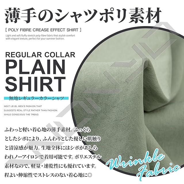 ふわっと軽い着心地の薄手素材。ふっくらとしたシボにより、ふんわりとした優しい肌触りと清涼感が魅力。生地全体にはシボがあしらわれノーアイロンで着用可能です。ポリエステル素材なので、軽量・速乾性にも優れています。程よい伸縮性でストレスのない着心地に◎