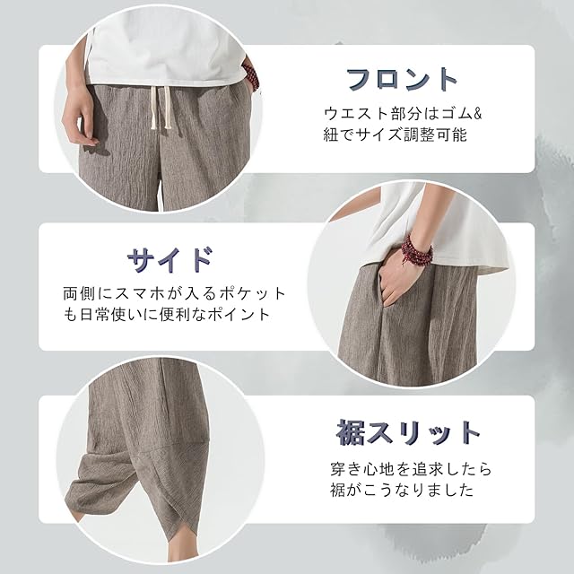 サルエルパンツ メンズ アラジンパンツ 夏用 ズボン 7分丈 ワイドパンツ 大きいサイズ ゆったり ボトムス イージー ぱんつ 涼しい リネンパンツ エスニック 袴 カジュアル クロップドパンツ 春 夏 自然なシワ感を楽しめる手もみハーフリネン ・軽量で爽やかな季節感のあるリネン混のこだわり素材。一言に透けているだけでなく、生地の隙間から感じられる透け感が、綺麗で上品な印象です ♪ ・綿と比べ、少しざらざらした硬い手触りが特徴のシャリ感がポイント。さらに少しだけ硬めの生地は汗で服に貼りつくこともなく抜群の快適さ。 ・バツグンの通気性で、着心地はもちろん見た目にも風合いのあるイメージをプラス。細い糸で織ることで軽やかで厚手では表しにくいギャザーやフレアーも存分にお楽しみ頂けます。 ・麻混による特有のゴワつきやちくちく感はありません。薄手ですが、程よい張り感があり、ほどよく目が詰まっています。夏のシーズンにはそんなシチュエーションにハマるパンツがマストアイテム。