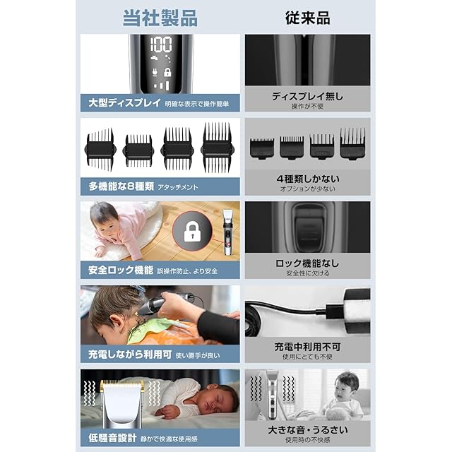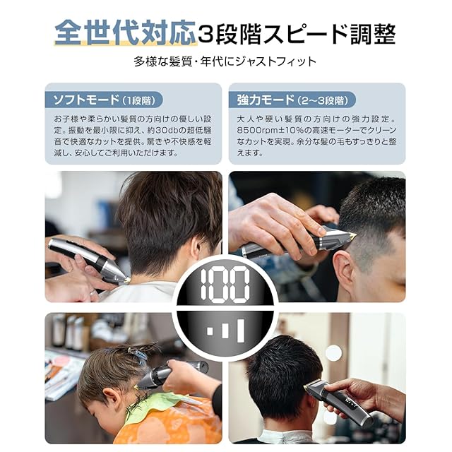 【LED大型ディスプレイ&安全ロック機能で操作も安心快適】本体には見やすいLEDディスプレイを搭載し、バッテリー残量やスピードモード、充電状況がひと目で確認可能。さらに安全ロック機能付きで誤作動を防止し、お子様のいる家庭でも安心して使用できます。 バリカン 防水仕様 でお風呂場でも使いやすく、髪やもみあげの細かい仕上げにも対応。防水設計+静音モーターで、夜間の使用も気兼ねなく行えます。コンパクトながら多機能で、 hair clipper や 電動バリカン 、トリマーとしても高評価。日常使いはもちろん、 子供 バリカン としての使用にも適した、安全性と使いやすさを兼ね備えた1台です。