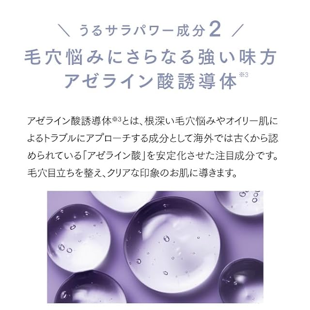 毛穴ケア・オイリー肌向け成分として大注目の「ナイアシンアミド(※1)」を高濃度12%配合。さらに「アゼライン酸誘導体(※2)」や「グリシルグリシン(※3)」などのサポート成分配合で、皮脂分泌による肌トラブルやテカリにアプローチし、なめらかでクリアな印象のお肌に導きます。 ※1 ナイアシンアミド(整肌成分) ※2 アゼロイルジグリシンK(整肌成分) ※3 グリシルグリシン(整肌成分)