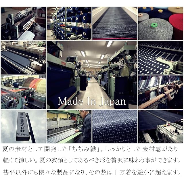 M~LLサイズはウエストにゴムが入っております。専用の取り替え口もあり簡単に交換可能! Sサイズのみウェストは紐で、ゴムは入っておりません。締め付け感がなく快適です。 パンツにはファスナー、両ポケット、サイドポケット付きです。 弊社開発の「ちぢみ織」です。 紡績、染、織布、加工全ての工程を日本で行っています。 綿のやさしい肌ざわり、軽くて涼しい夏の素材として、大好評を得ています。 たて糸に透かしを入れ、生地の整理加工工程でタンブラー機に掛けます。透かした部分の横糸が縮むことによりの凹凸感が生まれ、清涼感のある風合いが出ます。 着込む程に肌になじみ、通風性も抜群です。 洗濯後、シボ感でちぢみが発生する場合がございます。
