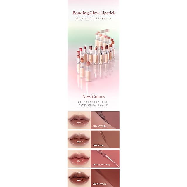 【ボンディング グロウ リップスティック】塗った瞬間から、輝くガラス玉のような光沢と、 水彩画のように淡く残る色彩で、色と光が唇に滑らかにボンディング(密着する)グロウリップスティック【塗った瞬間ガラスが輝くような光沢感】唇に触れた瞬間、体温でとろけてなめらかに唇に溶け込み、しっとりと唇に馴染んで密着します【輝きを保ちながらべたつきを感じさせない】唇に膜を作り、高い屈折率で光を強く反射させるハイシャイン・オイル・コンプレックスを配合し、ガラス玉のような輝きを表現しながらも、みずみずしいしっとり感でつるんとした仕上がりに【ナチュラルな水彩画のような発色】夕方の暗い空間や、室内で煌々と光るライトの下でも、 本来の色がそのまま唇のカラーとなり、水彩画のように淡く唇に染めて、ナチュラルな唇を演出します【透明感のあるニュアンスカラー】ユニークなヌードカラーからナチュラルなニュートラルカラー、深く濃密なポイントカラーまでそれぞれのカラーに合わせて透明度を細かく調整されているため、「グラデーションリップ」や「オーバーリップ」など、多彩なルックを表現できる幅広いカラーバリエーションです