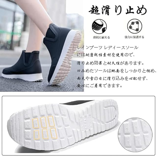 【超滑り止め】:レインブーツ レディースソールには耐磨耗性素材を使用ので、滑り止め効果と耐久性があります。凹凸めたソールは地面をしっかりと掴め、雨天や雪の日に滑り込みを心配せず、安心にご着用できます。