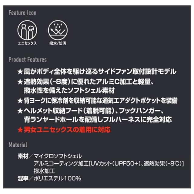 ★風がボディ全体を駆け巡るサイドファン取付設計モデル ★遮熱効果(-8度)に優れたアルミC加工と軽量、撥水性を備えたソフトシェル素材 ★背ヨークに保冷剤を収納可能な通気エアダクトポケットを装備 ★ヘルメット収納フード(着脱可能)、フックハンガー、背ランヤードホールを配備しフルハーネスに完全対応 ★男女ユニセックスの着用に対応 ◆ユニセックス ◆撥水/防汚 ■大型フードスピンドル付き(ボタン止め脱着仕様) ■フードプリント ■バッテリー収納ポケット(左・ファスナー止め・コードホール付) ※特許取得済 ■ハーネスフックハンガー取付ベルト&取り出し口 ■袖ペンポケット ■内バッテリーポケット(左・ドットボタン止め) ■両脇サイドファン ※特許取得済 ■内側コードループ付 ■ランヤード取付口 ※特許取得済 ■拾ダイレクトエアー ※特許取得済 ■袖口しぼりひも通し穴 ■コードストッパー(ドットボタン止め) 【シーズン 春夏】 【素材 マイクロソフトシェル、アルミコーティング加工[UVカット(UPF50+)、遮熱効果(-8℃)]、撥水加工】 【混率 ポリエステル100%】 【用途 屋外作業・農作業・アウトドア・レジャー・ゴルフ・釣りなど・スポーツ観戦】 【カラー カモフラブラック】 【サイズ S M L XL XXL 3XL】