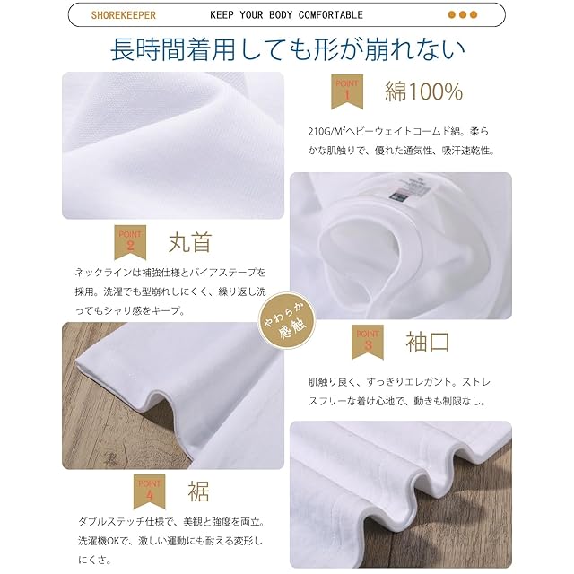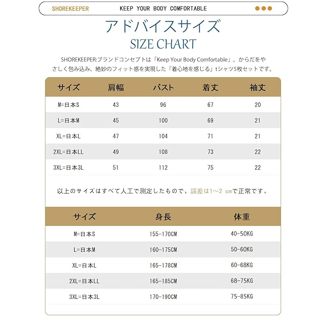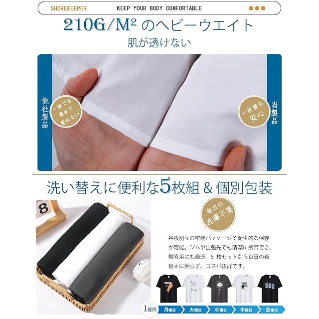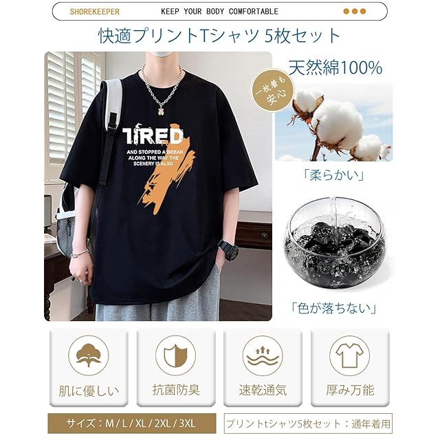 <p><b>[SHOREKEEPER] Tシャツ メンズ 半袖 5枚セット 綿100% ゆったり プリント 丸首 吸汗速乾 通気性 抗菌防臭 柔らかい 快適 インナーシャツ カジュアル おしゃれ 肌着 春 夏 秋 冬</b></p> <ul> <li>素材: コットン100%</li> <li>適用対象:メンズ</li> <li>サイズ:M、L、XL、2XL、 3XL</li> <li>季節に適しています:春、夏、秋、冬</li> </ul> <ul> <li>「サイズ選択注意」本品は日本サイズより1サイズ小さいです。例:普段Mサイズの方はLサイズをお選びください。または、サイズ表の体重を参考にご選択ください、ゆとりある着用感をお求めの場合は、さらに1サイズアップをおすすめします。</li> <li>「オールシーズン対応&便利な5枚組」丸首半袖プリントTシャツ。生地の質感は上品で、夏は涼しく通気性抜群、冬は保温性も良好で、一年中快適に着用可能。月~金の5日間をカバーするセットで、洗濯や着替えの手間を軽減。この品質での5枚組は、コストパフォーマンス抜群。自分用はもちろん、家族へのプレゼントにも最適!</li> <li>「コームド綿&抗菌防臭」210G/M²の綿100%コームド綿生地を採用。天然素材の柔らかさが肌に優しく、敏感肌やかゆみが気になる方もご安心。通気性の良い綿は吸汗速乾性に加え防臭性もあり、脇汗や部屋干しのニオイを防止。長時間着用でも快適さを持続。 </li> <li>「個別包装&マルチシーン対応」各Tシャツは個別密封袋包装。防塵・防湿で収納に便利。出張やジムでの利用もラクラクで、衛生的です。体型を選ばないシルエット設計で、様々な体型を美しく見せ、スタイルアップをサポート。通勤、軽い運動、アウトドア、部屋着、寝間着、ビジネス、デートなど、幅広いシーンで活躍します。</li> <li>「スタイリッシュに着こなせるTシャツ」春夏はシングル着用、秋冬にはシャツ、スウェット、ダウン、ジャケットなどのインナーとして重ね着可能。ボトムスにはジーンズ、チノパン、ショートパンツ、カジュアルスーツなどと相性抜群。ユニセックスで、中学生、高校生、大学生から中高年まで、男女問わず、全年齢層の人気ファッションアイテムです。 </li> <li>「丁重に声明する」購入後30日以内に、ご不満があった際は、返品・返金対応いたします。弊社が数年前から服を販売していますが、弊店にすべての商品は実物をそのままで撮影したので、ご安心して買いていただくようお願い申し上げます。</li> </ul>