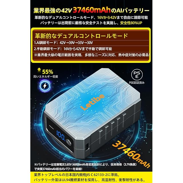 商品名:[Letibe] 【日本優良企業】 37460mAh 42V 最強 ファン付きベスト ハイバックファン設計 –18℃の遮熱効果 空調作業服 ファンバッテリーセット 16Vから42Vまで調節可能 AI機能搭載 デュアルコントロールモード 30W超高速充電 発火防止アルミ加工 防塵カバー付き 作業用ツールバッグ付き UVカット 暑さ対策 熱中症対策 PSE認証済