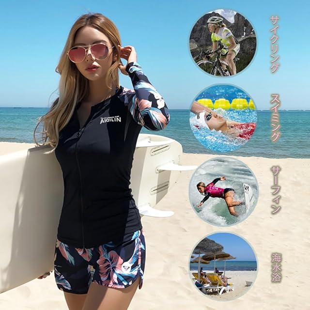 <b>【セット内容】</b><br/> 長袖ラッシュガード、ショートパンツ、ブラ、レギンス、ビギニショーツがセットになっています。長袖ラッシュガードとレギンスセット、レギンス付き足首まであるので、虫刺されやクラゲ対策、擦り傷などの外傷対策にも。<br/><br/> <b>【吸汗速乾】</b><br/> 速乾性に優れた水着素材なので、海やプールだけでなくジムやヨガなど 、汗をかくシーンでの使用もOK、水陸両用で全アイテム着たまま水に入れます。軽量なのでとても動きやすく、最適の機能性、吸汗速乾通気のドライ繊維、激しい運動の後もさらっとした着心地!<br/><br/> <b>【UVカット】</b><br/> 安心のUV対策生地を使用しているため(肌に有害な紫外線を98%以上カット)、日差しが強い時の日焼け防止にも大活躍。もちろん紫外線対策もばっちりでお肌を守ります、防菌防臭。<br/><br/> <b>【優れたデザイン】</b><br/> お洒落な柄プリントすっきりしたシンプルなデザイン、機能性だけでなくデザインも考え抜かれた商品です。襟元、手首、足首にスキンケアデザインを使って、運動の快適性をします。<br/><br/> <b>【適用場合】</b><br/> 夏場のウォータースポーツや野外活動の際、海、ジム、プールやビーチ、、温泉と幅広いジャンルで使える便利なスポーツ・アイテムです。通勤、通学、ランニング、ヨガなど、スポーツウェアとしてもご利用いただけます。