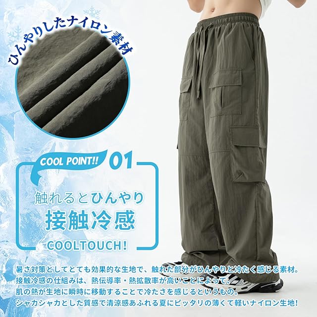 [Fasshonrida] 冷感 カーゴパンツ メンズ 涼しい ズボン アイスシルク ワイドパンツ 撥水 アウトドア ワークパンツ ロング丈 ボトムス かっこいい 無地 ミリタリーぱんつ 大きいサイズ 夏服 ゆったり men pants 春 夏 秋 khaki green M