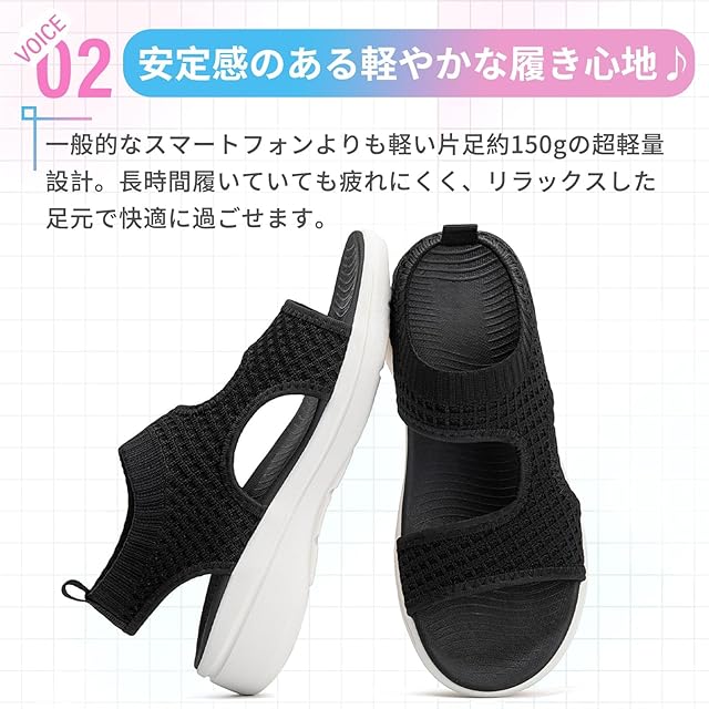 √【安定感のある軽やかな履き心地】一般的なスマートフォンよりも軽い片足約150gの超軽量設計。とても軽くて歩きやすく、柔らかい素材で出来ているところがロングセラー商品の秘訣です。ストラップがゴム仕様だから片手で着脱できてノンストレス!ストラップが甲周りをサポートするから走れるんです。