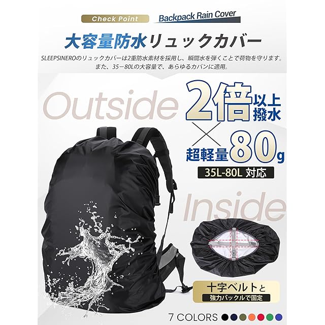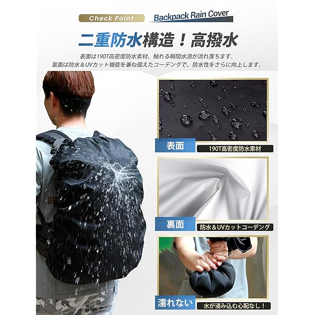 【2倍以上!防水レインカバー】SLEEPSINEROのリュックカバーは2重防水素材を採用し、瞬間水を弾くことで荷物を守ります。表地は190T高密度ポリエステル素材、水をしっかりガード、大豪雨でも水に濡れない。✅裏地は撥水性・遮光遮熱性を持つコーデング加工済み、水の浸入を効果的に防止できます。二重防水になっており、リュック防水カバー一枚使用すると、長時間雨での走行でも荷物が濡れない。また、遮光性・遮熱性あるので、荷物の変形・温度上昇も防ぎます。