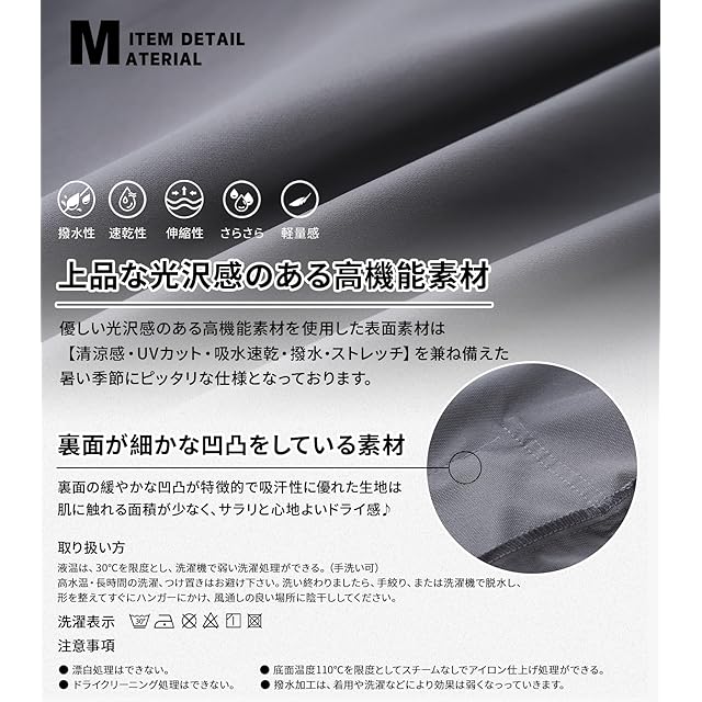 つるっと表面が艶やかな機能的生地を採用。生地の表面に撥水用の特殊皮膜をコーディングすることによって、水をはじくので快適に着用していただけます。伸縮性や耐久性に優れた伸縮素材を配合することで肌ざわりがよく、穿いてリラックスできるアイテムです。裏面の緩やかな凹凸が特徴的で吸汗性に優れた生地は、肌に触れる面積が少なく、サラリと心地よいドライ感♪速乾性があり、水分をすばやく吸い、すばやく乾き、サラサラした穿き心地を保ってくれます。汗ばむ季節でも快適に楽しめる!