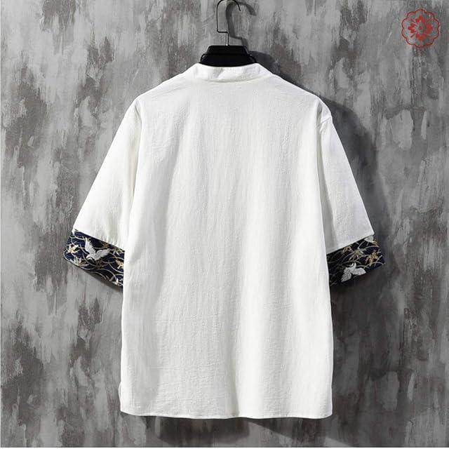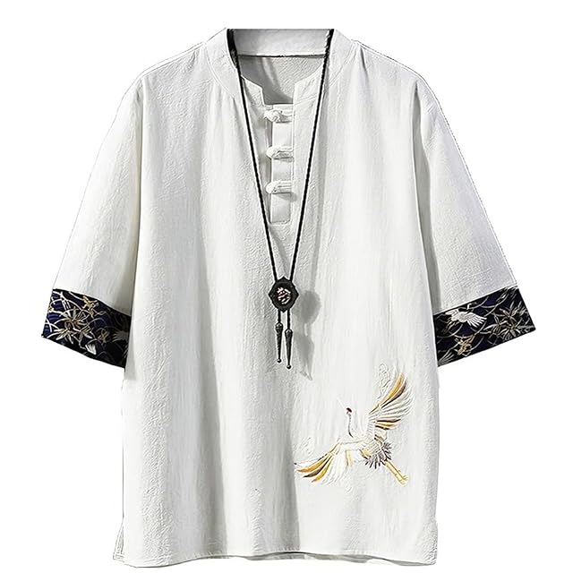 [foveitaa] メンズ 夏服 シャツ Tシャツ リネン シャツ 半袖 綿麻 和風 和柄 刺繍 七分袖 五分袖 大きい サイズ カジュアル ゆったり おしゃれ 無地 Vネック ファッション カットソー 吸汗速乾 トップス white XL