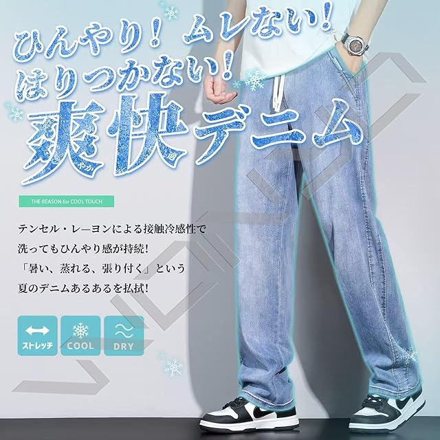 [W Wonyo] デニムライク ズボン メンズ ワイドパンツ ウォッシュ加工 テンセル 涼しい 薄手 ストレート イージーパンツ 冷感 アイスシルク 軽快 夏服 ずぼん 通気 吸湿 カジュアルぱんつ 伸縮 ボトムス 大きいサイズ ゆったり トラウザーズ 春 夏 秋 saxe 2XL