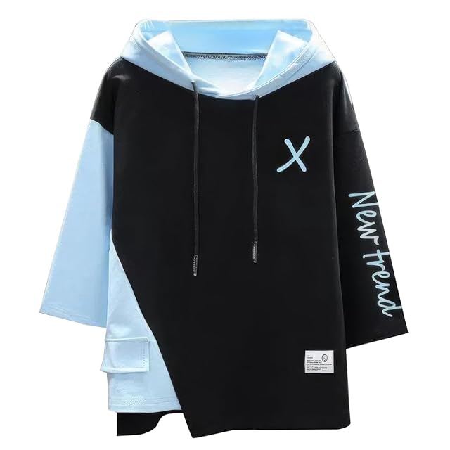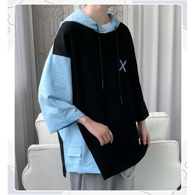 [foveitaa] Tシャツ メンズ 夏服 ゆったり 七分袖 パーカー 半袖 夏 Tシャツ 洋服 おしゃれ 大きいサイズ フード付き ゆったり カジュアル プルオーバー シャツ black M