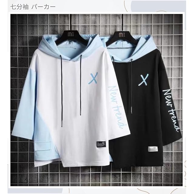商品名:[foveitaa] Tシャツ メンズ 夏服 ゆったり 七分袖 パーカー 半袖 夏 Tシャツ 洋服 おしゃれ 大きいサイズ フード付き ゆったり カジュアル プルオーバー シャツ black M